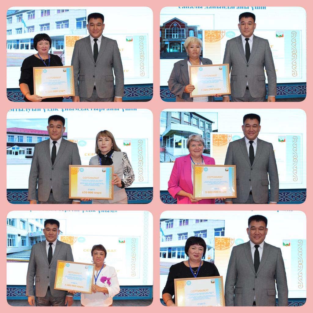Білім беру кеңістігін жүйелі жоспарлы дамытқаны үшін, өскелең ұрпақты тәрбиелеу мен оқыту процесінде жоғары нәтижелерге қол жеткізгені үшін 9,0 млн теңге сомасына сыйлық сертификаттары Май және Новоильинов мектептеріне табысталды.