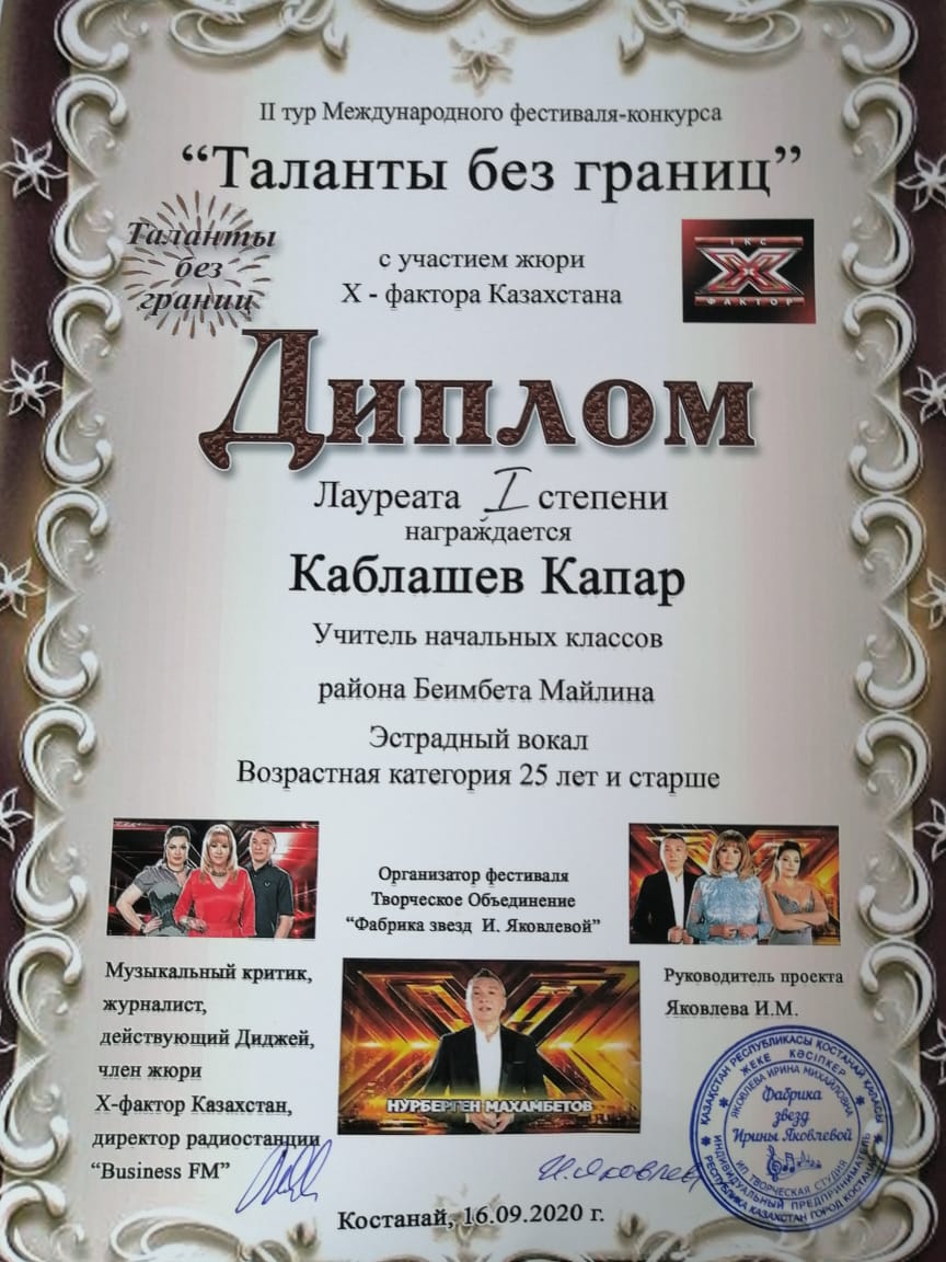 Ағымдағы жылдың 16 қыркүйегінде Қостанай қаласында "Шексіз дарын иелері" халықаралық фестиваль-байқауының 2 кезеңі Х-Фактор Қазақстан əділқазысы Нұрберген Махамбетовтың қатысуымен өтті. "Бейімбет Майлин ауданы əкімдігі білім бөлімінің Май орта мектебі " КММ бастауыш сынып мұғалімі Қаблашев Қапар Қайырұлы І дəрежелі лауреат дипломының иегері атанды.
